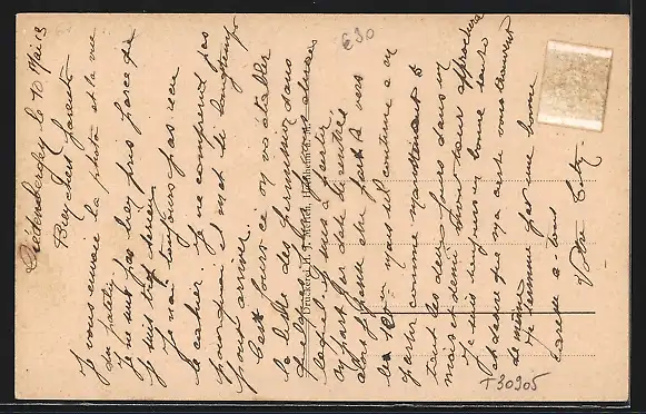 Personenbezogene Daten auf der Rückseite der Karte wurden durch blauen Textmarker unkenntlich gemacht. Die blauen Stellen sind auf die Vorderseite durchgeweicht und wirken sich negativ auf das Postkartenfoto aus