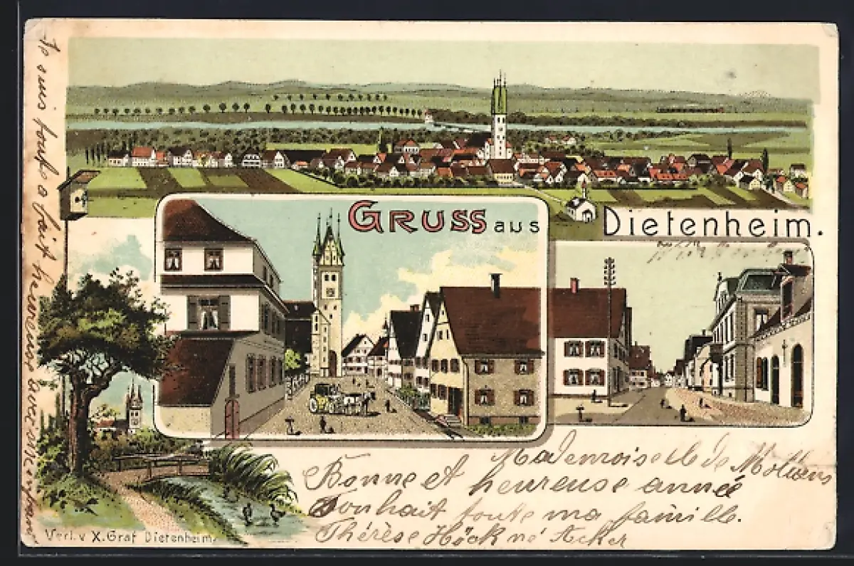 Lithographie Dietenheim, Totale und zwei Ortspartien
