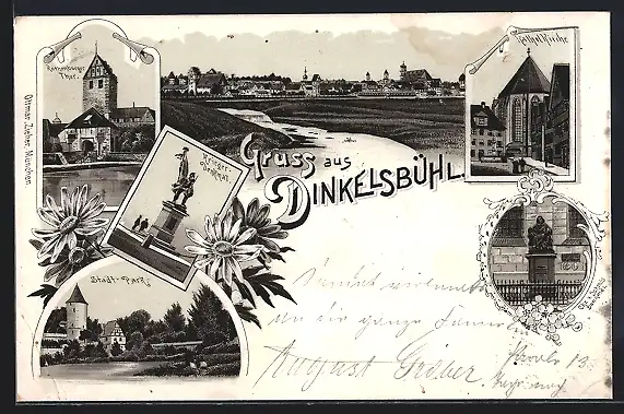 Lithographie Dinkelsbühl, Gesamtansicht, Katholische Kirche, Rothenburger Tor & Stadt-Park