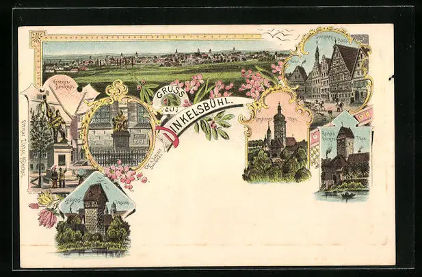 Lithographie Dinkelsbühl, Haucke-Turm, Rothenburger Tor, Krieger-Denkmal