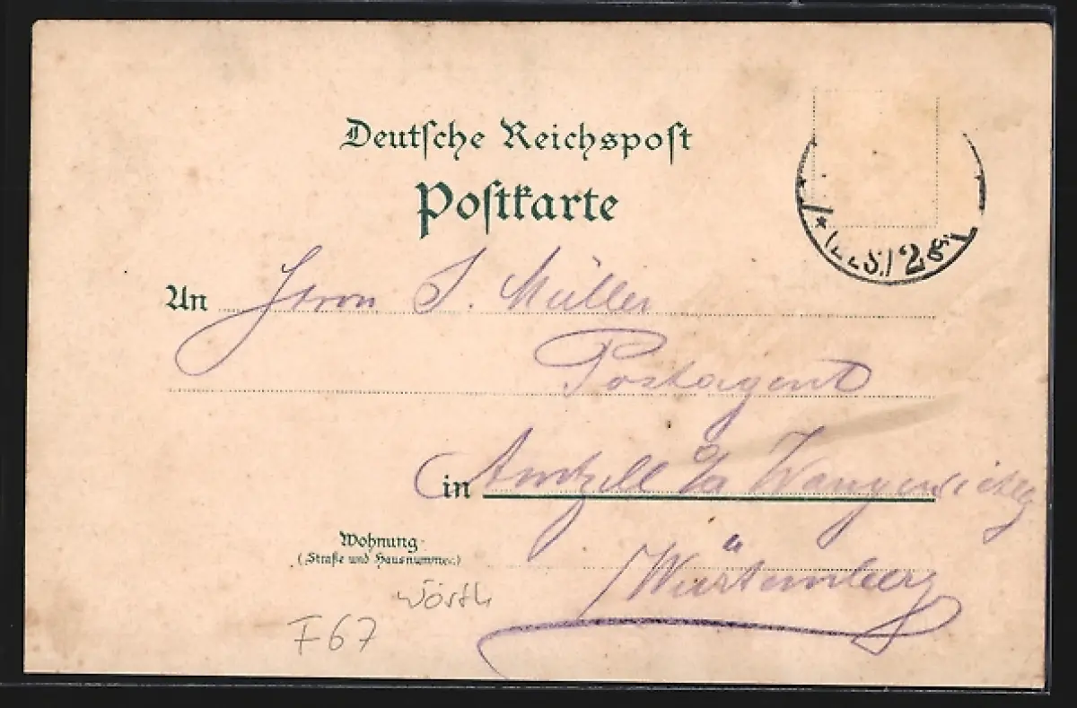Personenbezogene Daten auf der Rückseite der Karte wurden durch blauen Textmarker unkenntlich gemacht. Die blauen Stellen sind auf die Vorderseite durchgeweicht und wirken sich negativ auf das Postkartenfoto aus