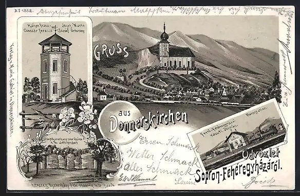 Lithographie Donnerskirchen, Kaiser Franz-Josef-Warte, Bahnhof mit einfahrendem Zug
