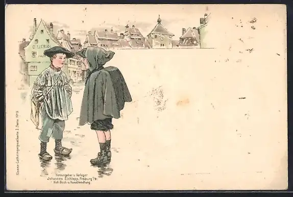 Lithographie Dorfpartie mit Kindern in elsass-lothringischer Tracht
