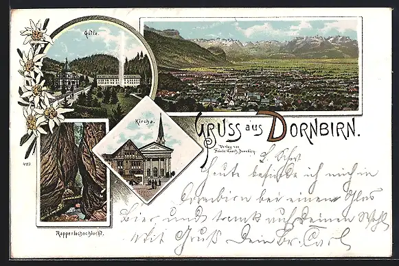 Lithographie Dornbirn, Totalansicht, Kirche & Rappenlochschlucht