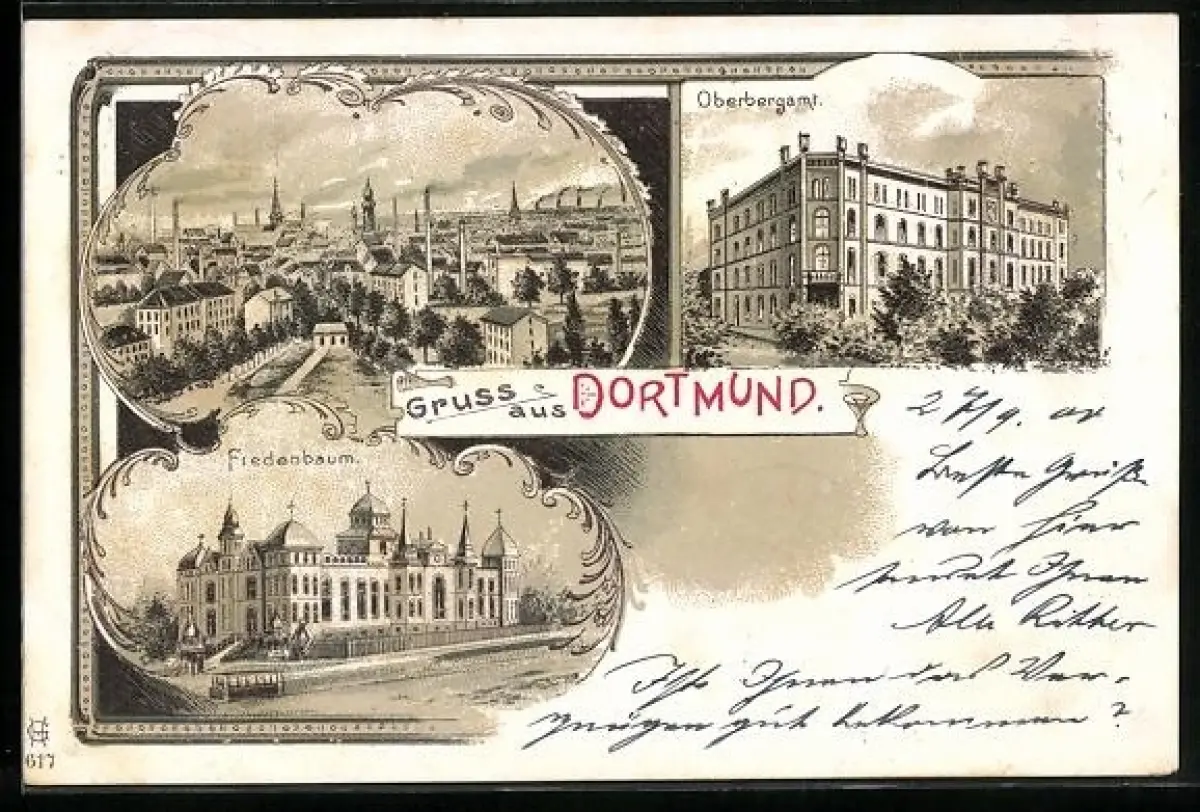 Lithographie Dortmund, Teilansicht, Oberbergamt, Fredenbaum mit Strassenbahn