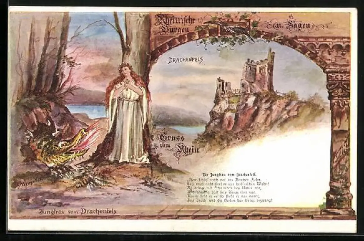 Lithographie Drachenfels, Jungfrau von Drachenfels, Burgruine, Rhein, Sage