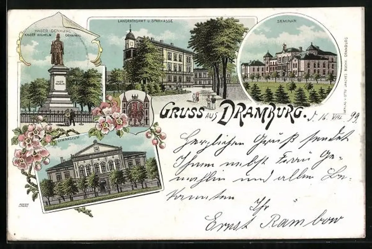 Lithographie Dramburg, Gymnasium, Seminar, Landrathsamt und Sparkasse