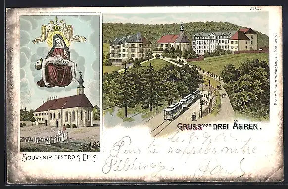 Lithographie Drei Ähren, Ortspartie mit Strassenbahn, Les Trois Epis