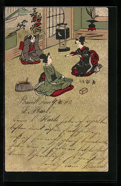 Lithographie Drei Geishas beim Gespräch in einem Zimmer