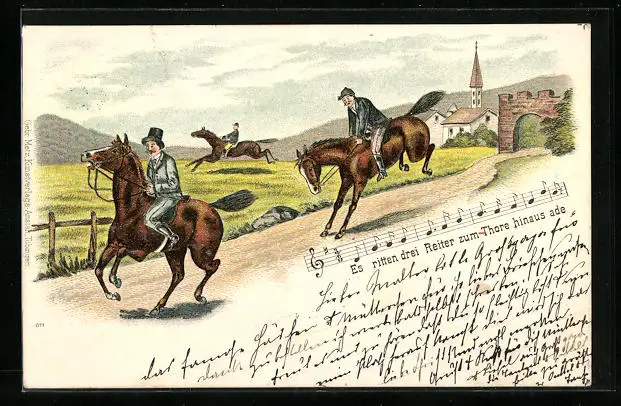 Lithographie Drei Reiter bei wildem Ritt vor einer Stadt