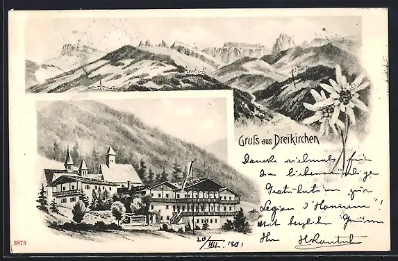 Lithographie Dreikirchen, Ortspartie mit Kirche, Gebirgs-Panorama, Edelweiss