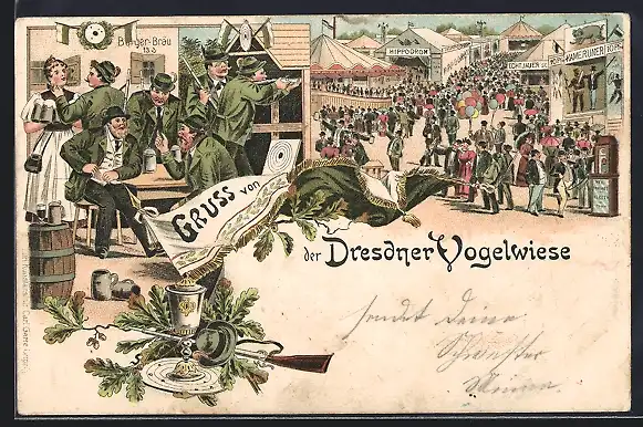 Lithographie Dresden, Dresdener Vogelwiese, Schützen, Hippodrom