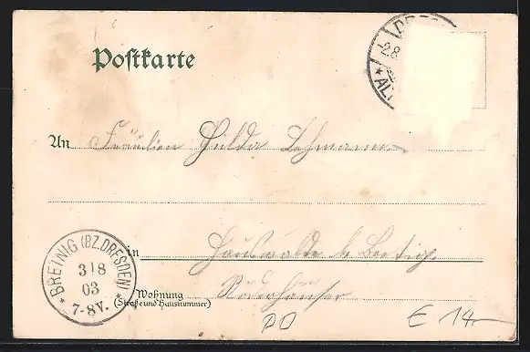 gelaufen 1903, Briefmarke entfernt, Eckknick li. oben, guter Zustand