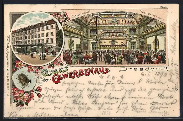 Lithographie Dresden, Gaststätte Gewerbehaus, Gebäude mit Vorplatz, Concert-Saal mit Trenkler-Concert, Wabe mit Bienen