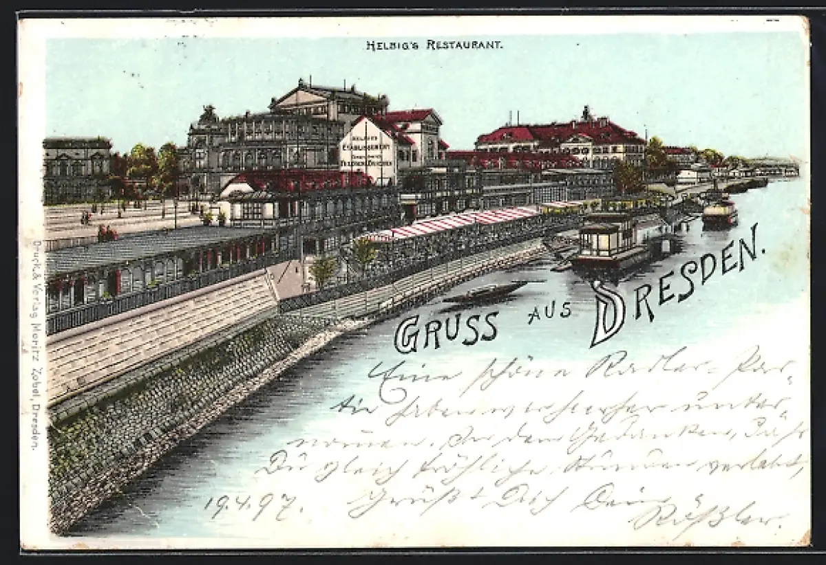Lithographie Dresden, Helbig`s Restaurant, Flusspartie mit Booten