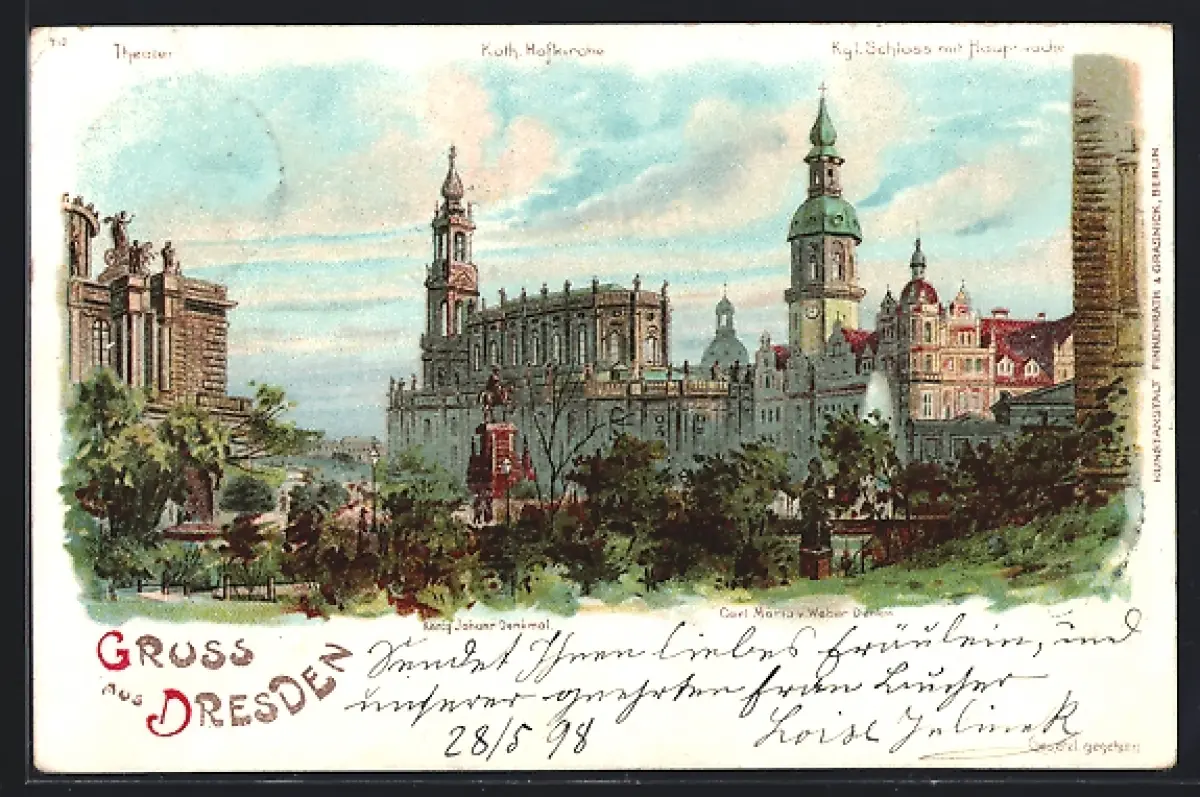 Lithographie Dresden, Hofkirche, Königliches Schloss m. Hauptwache, Denkmäler