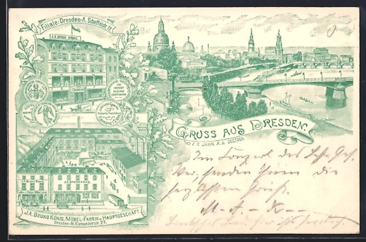 Lithographie Dresden, J. A. Bruno König Möbel-Fabrik, Kamenzerstrasse 27, Filiale Scheffelstrasse 17