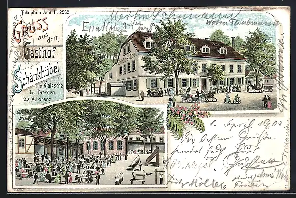 Lithographie Dresden-Klotzsche, Gasthof Schänkhübel mit Gartenlokal