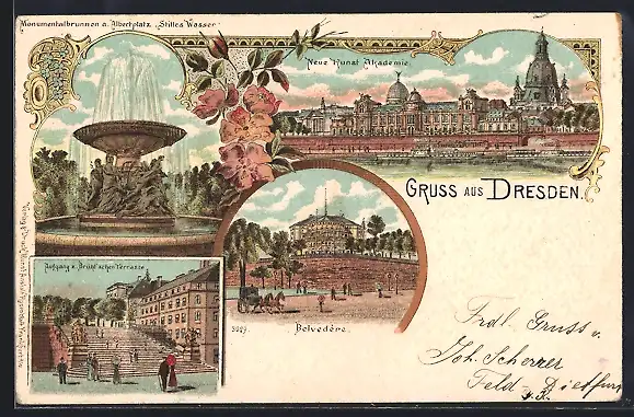 Lithographie Dresden, Neue Kunst Akademie, Aufgang z. Brühl` schen Terrasse, Belvedére, Monumentalbrunnen