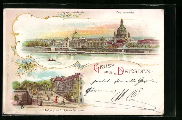 Lithographie Dresden, Panorama mit Frauenkirche, Aufgang zur Brühlschen Terrasse