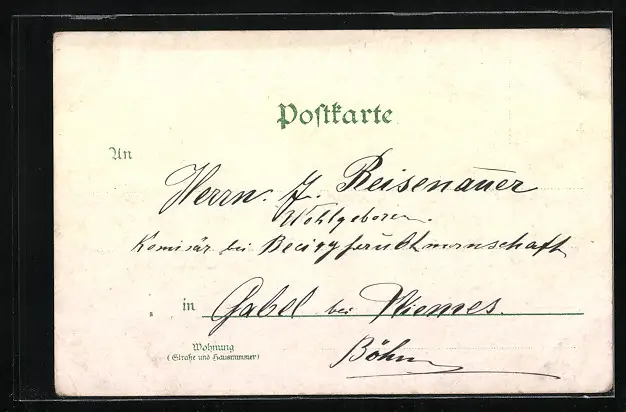 Personenbezogene Daten auf der Rückseite der Karte wurden durch blauen Textmarker unkenntlich gemacht. Die blauen Stellen sind auf die Vorderseite durchgeweicht und wirken sich negativ auf das Postkartenfoto aus