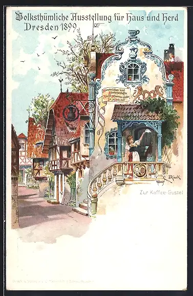 Lithographie Dresden, Volkstümliche Ausstellung für Haus und Herd 1899, Kaffee-Gustel, Ganzsache