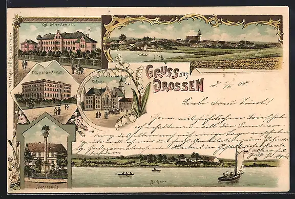 Lithographie Drossen, Kgl. Lehrer-Seminar, Präparanden-Anstalt, Rathaus, Siegessäule