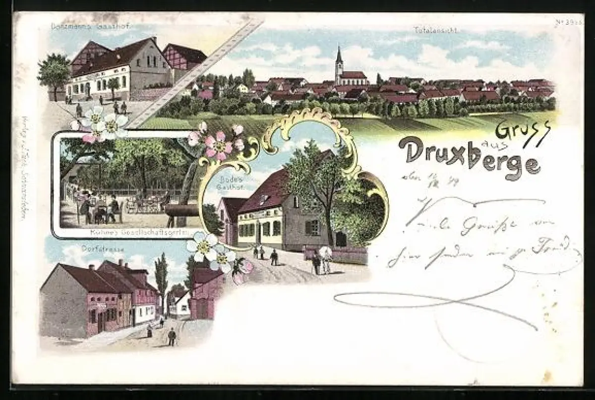 Lithographie Druxberge, Danzmann`s Gasthof, Kühne`s Gesellschaftsgarten, Bode`s Gasthof und Dorfstrasse