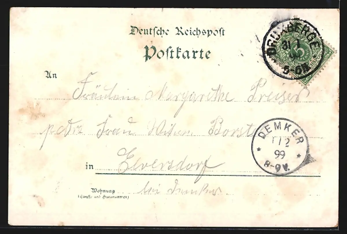 Personenbezogene Daten auf der Rückseite der Karte wurden durch blauen Textmarker unkenntlich gemacht. Die blauen Stellen sind auf die Vorderseite durchgeweicht und wirken sich negativ auf das Postkartenfoto aus