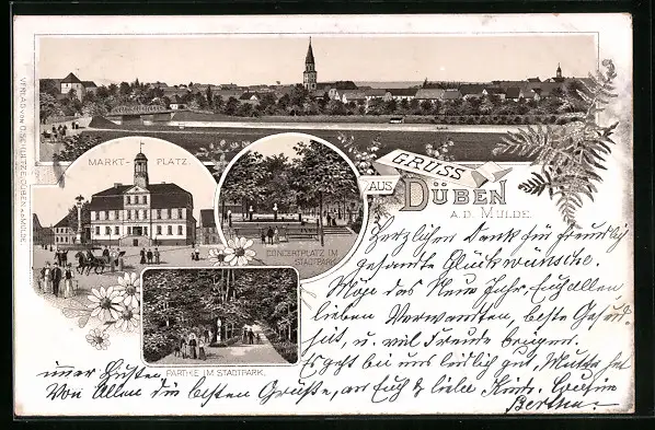 Lithographie Düben /Mulde, Ortspanorama, Concertplatz im Stadtpark, Marktplatz