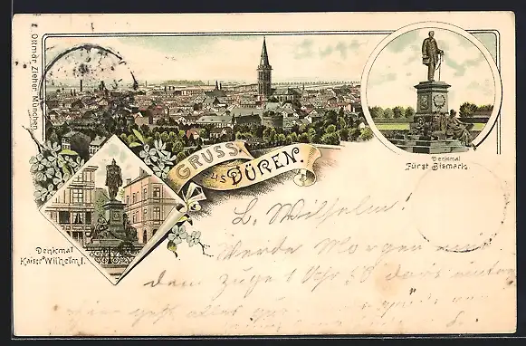 Lithographie Düren, Teilansicht, Denkmal Früst Bismark, Denkmal Kasier Wilhelm I.