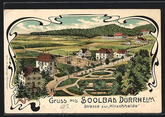 Lithographie Dürrheim, Strasse zur Hirschhalde aus der Vogelschau