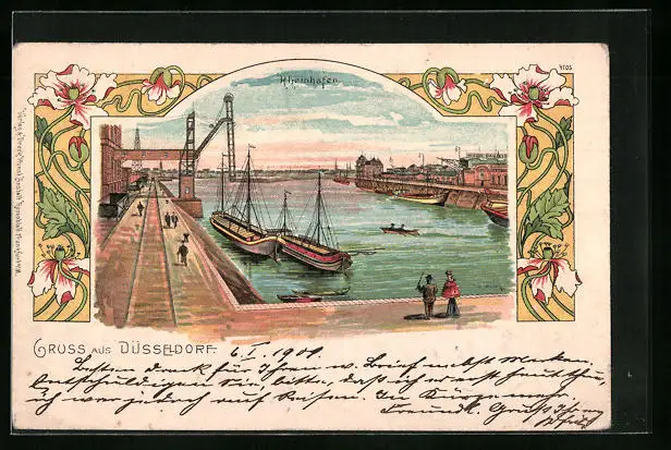 Lithographie Düsseldorf, Schiff im Rheinhafen