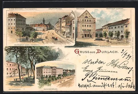 Lithographie Durlach, Markgraf-Karl-Denkmal, Marktplatz, Amtsgericht u. Schulgebäude