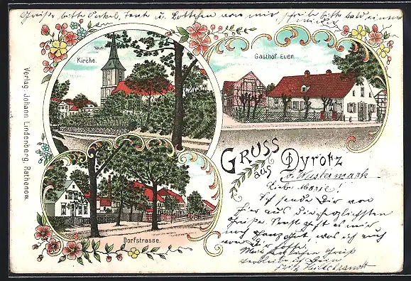 Lithographie Dyrotz, Gasthof Euen, Kirche, Dorfstrasse
