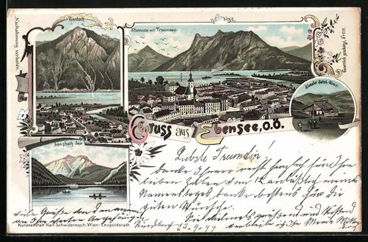 Lithographie Ebensee /O.Ö., Kranabet Sattel-Alm, Langbath-See, Rinnbach gegen die Berge, Totalansicht
