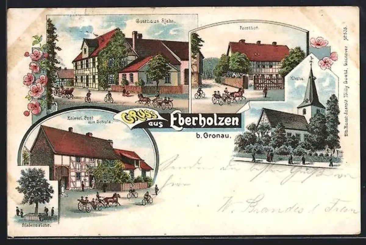 Lithographie Eberholzen b. Gronau, Gasthaus Rieks, Kaiserliche Post mit Schule, Forsthof und Kirche