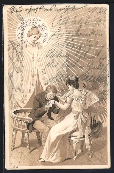 Lithographie Ehefrau auf Fächer duldet Seitensprung ihres Mannes