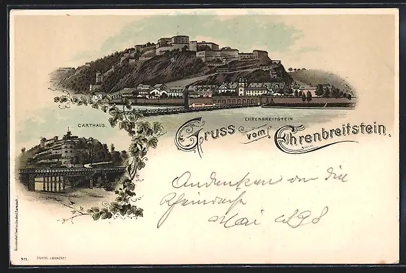 Lithographie Ehrenbreitstein, Blick zur Festung, Carthaus