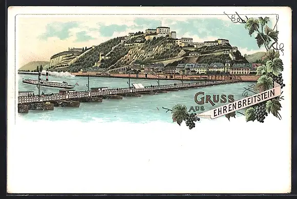 Lithographie Ehrenbreitstein, Teilansicht mit Festung