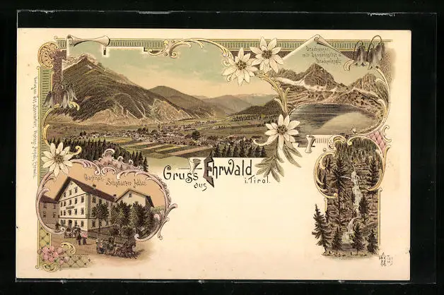 Lithographie Ehrwald, Gesamtansicht mit Gasthof Schwarzer Adler