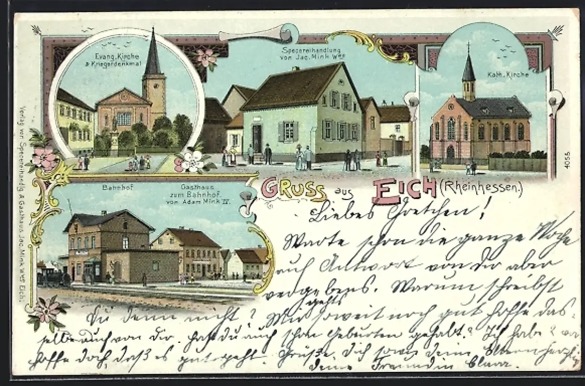 Lithographie Eich /Rheinhessen, Gasthaus zum Bahnhof, Inh. Adam Mink IV., Bahnhof, Spezereihandlung v. Jac. Mink Wwe.