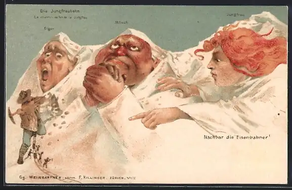 Lithographie Eiger, Mönch und Jungfrau, Arbeiter bauen Gleise für Jungfraubahn, Berggesichter