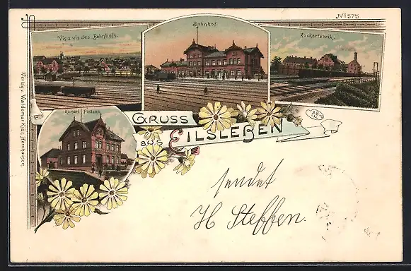 Lithographie Eilsleben, Zuckerfabrik, Kaiserliches Postamt, Bahnhof