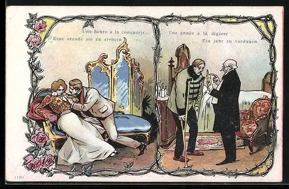 Lithographie Eine Stunde sie zu erobern-ein Jahr zu verdauen, Mann hat sich eine Geschlechtskrankheit geholt, Erotik