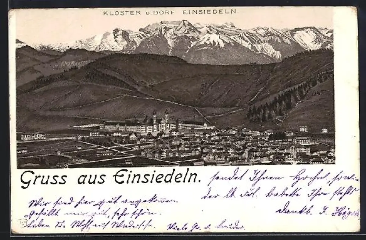 Lithographie Einsiedeln, Kloster und Ort aus der Vogelschau