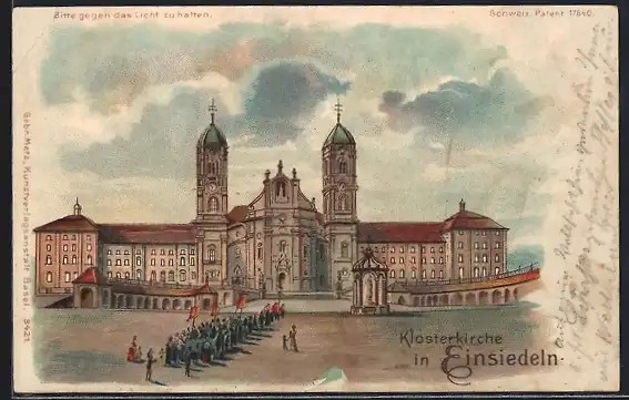 Lithographie Einsiedeln, Klosterkirche mit Prozession, Gnadenbild darüber, Halt gegen das Licht