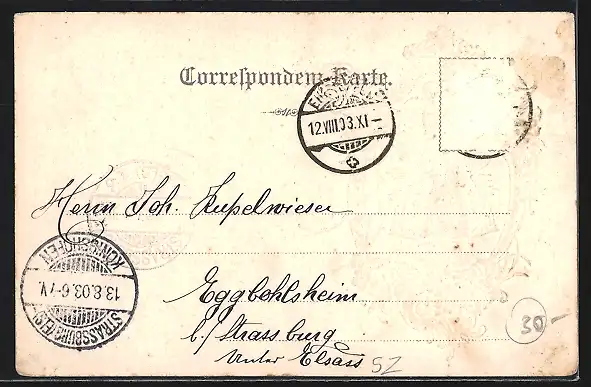 gelaufen 1903, Briefmarke entfernt, kl. Einriss unten re., guter Zustand