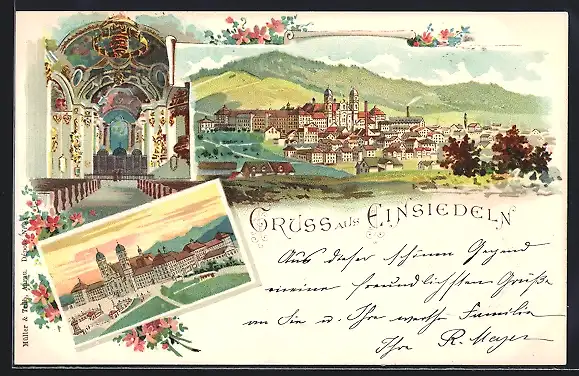Lithographie Einsiedeln, Ortsansicht, Kirche von aussen und innen