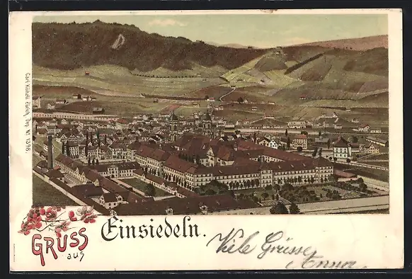 Lithographie Einsiedeln, Ortsansicht aus der Vogelschau